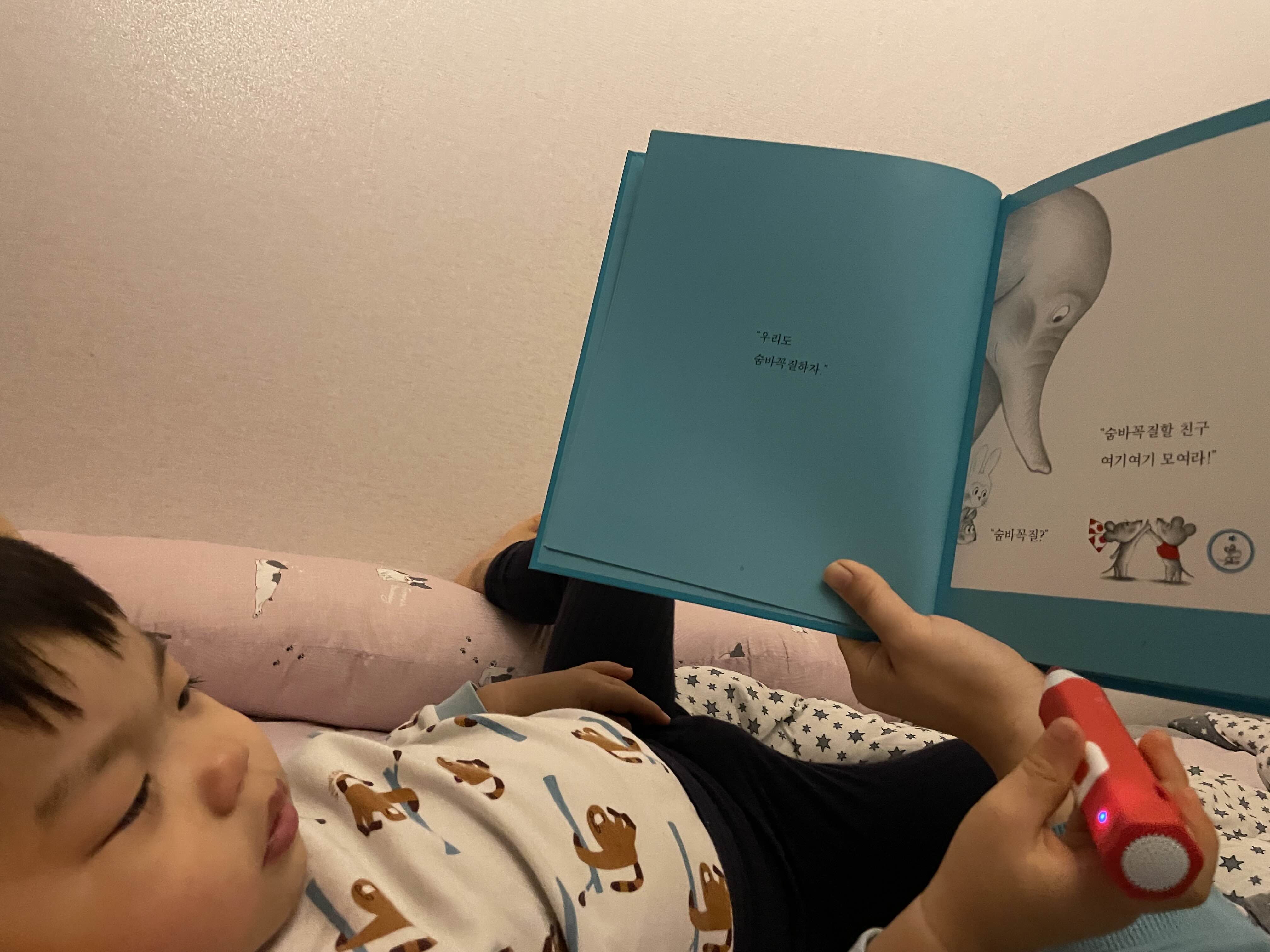 자기가 꼭 찍어야 한다구 저렇게 꼭 쥐고 있다가 잘 때도 쥐고 잔다 ㅋㅋㅋㅋ 세이펜은 꼭 침대 옆이 제자리. 근데 이 책 첨엔 안볼라구 하더니 세이펜으로 읽어주니 최애책 되어버리네?